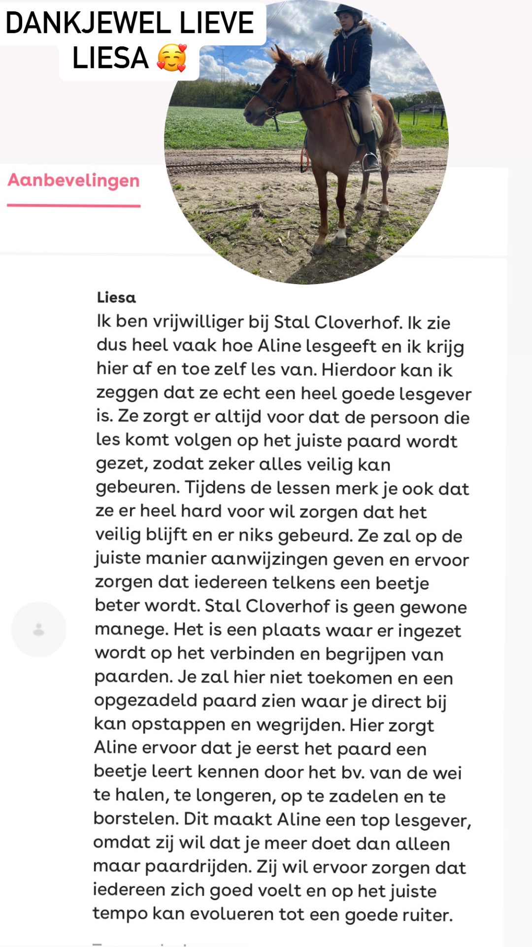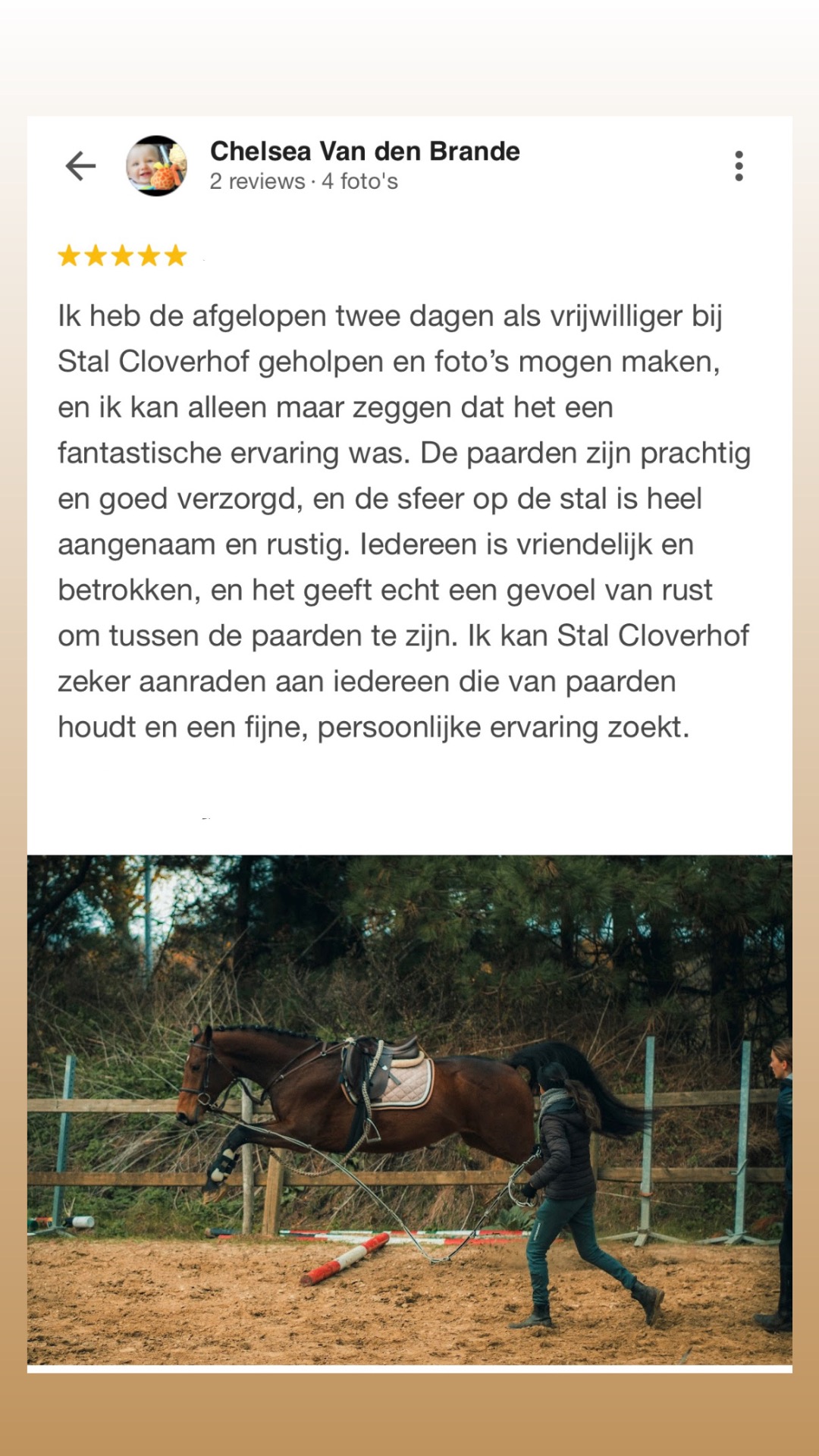 Bij Stal Cloverhof kun je rekenen op een geweldige ervaring, ongeacht je leeftijd of ervaring. Jong en oud zijn welkom om ons te helpen bij de dagelijkse verzorging en training van onze paarden. Geen verplichtingen, enkel plezier en leren op je eigen tempo!