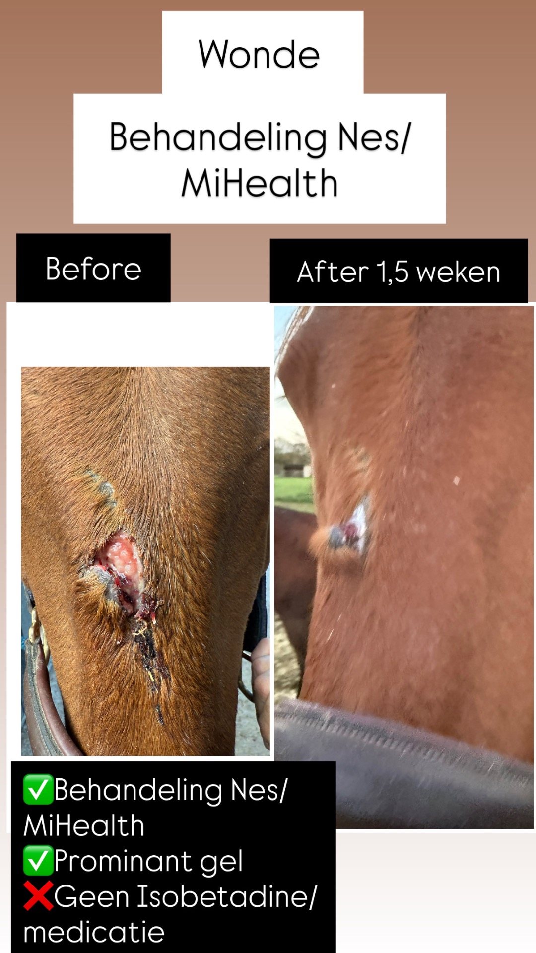 Dit paard had een stevige kopstoot gekregen door met zijn hoofd tegen een betonnen balk te springen. Meteen behandeld met de Mihealth. Wat normaal voor zwelling zou zorgen was nu niet het geval door meteen te behandelen.